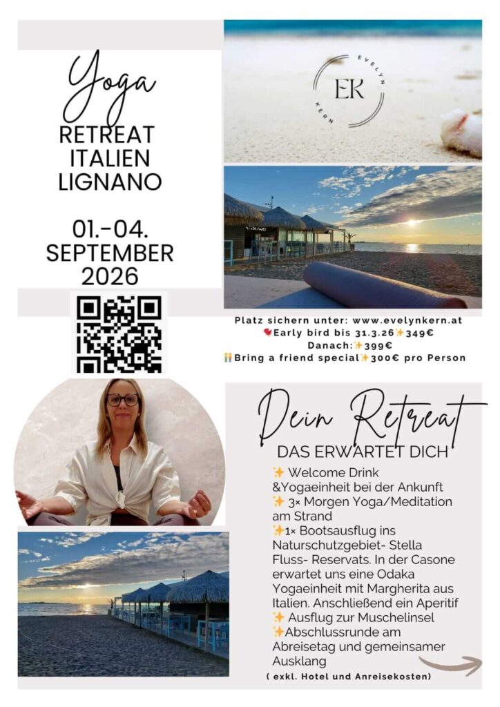 Highlight/Odaka Yoga in der Casone, Bootsfahrt entlang des Flusses Stella, Odaka Yoga mit der italienischen Yogalehrerin Margherita. Mitten in der Natur, ein einzigartiges Erlebnis mit anschließendem Aperitif in der Casone